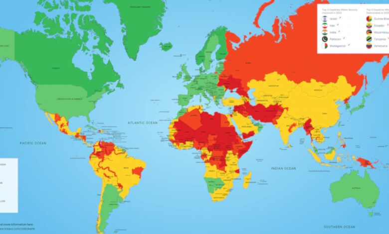 Değerlendirmede suç oranı, huzursuzluk, eylemler, terörizm, silahlı çatışma, giriş- çıkış şartları, ulaşım seçenekleri, grevler, altyapı, sağlık hizmetleri, doğal afetler, çevresel faktörler, ekonomik güvenlik, eşcinsellere yaklaşım gibi kriterler dikkate alındı. Koyu yeşille gösterilen ülkeler en güvenli, yeşille gösterilenler güvenli olarak belirlendi.