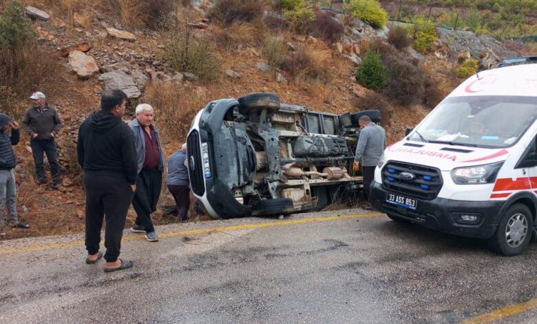 Kaza, ilçeye bağlı Esenpınar Mahallesi Ağlıca mevkiinde meydana geldi. Alınan bilgiye göre, Erdemli istikametine seyreden A.T. yönetimindeki elma yüklü 33 VG 386 plakalı kamyonet, yağışla kayganlaşan yolda sürücüsünün direksiyon hakimiyetini kaybetmesiyle şarampole devrildi. Kazada sürücü ile birlikte araçtaki yolcular S.T. ve H.P. yaralandı. Diğer sürücülerin haber vermesiyle kaza yerine ambulans, itfaiye ve jandarma ekipleri sevk edildi.Yaralılar, ambulanslarla ilçe devlet hastanesi acil servisine kaldırıldı.