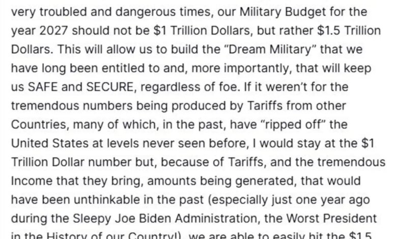 Trump, bütçe artışını gümrük vergilerinden karşılayacaklarını açıkladı. Bu gelirlerle birlikte 1 buçuk trilyon dolarlık askeri bütçeye kavuşacaklarını ve aynı zamanda borçları azaltacaklarını, vatanseverlere kar sağlayacaklarını ifade etti. – WASHINGTON